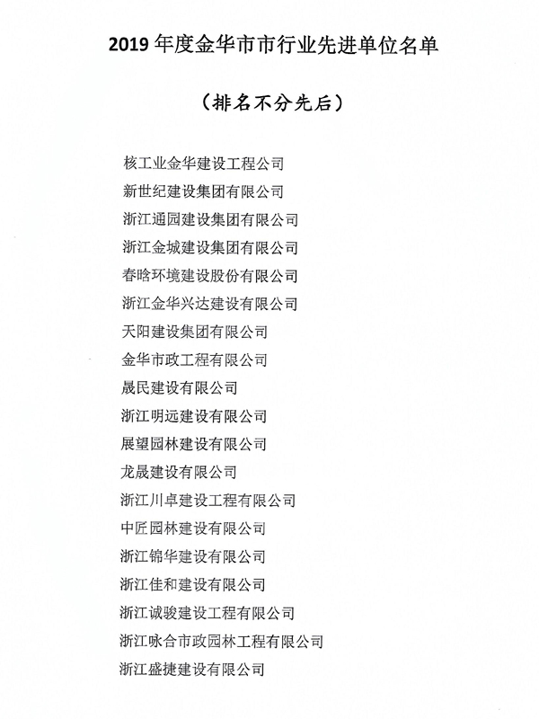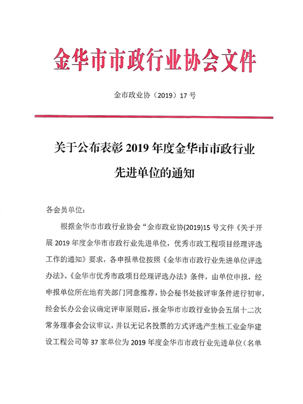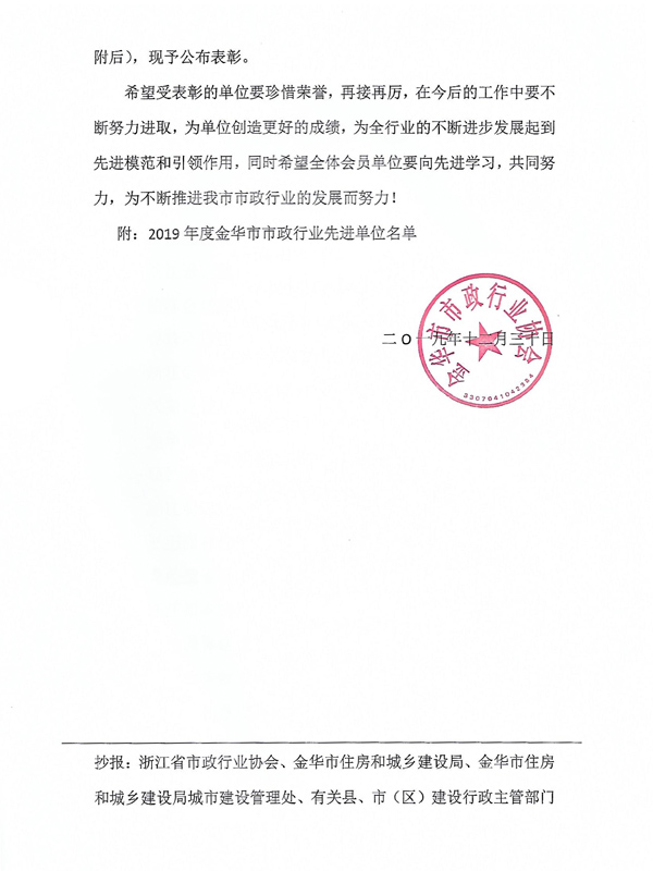 2019年金華市市政行業(yè)先進(jìn)單位