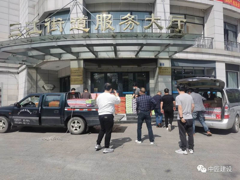 4月21日下午,中匠園林建設有限公司占旭君董事長帶領副總經理金立勤、孫忠華等公司骨干人員,滿載著牛奶、礦泉水、八寶粥、方便面等物資,前往三江街道和洪塢社區慰問堅守在疫情一線的抗疫人員,為打贏這場疫情防控狙擊戰盡一份綿薄之力。